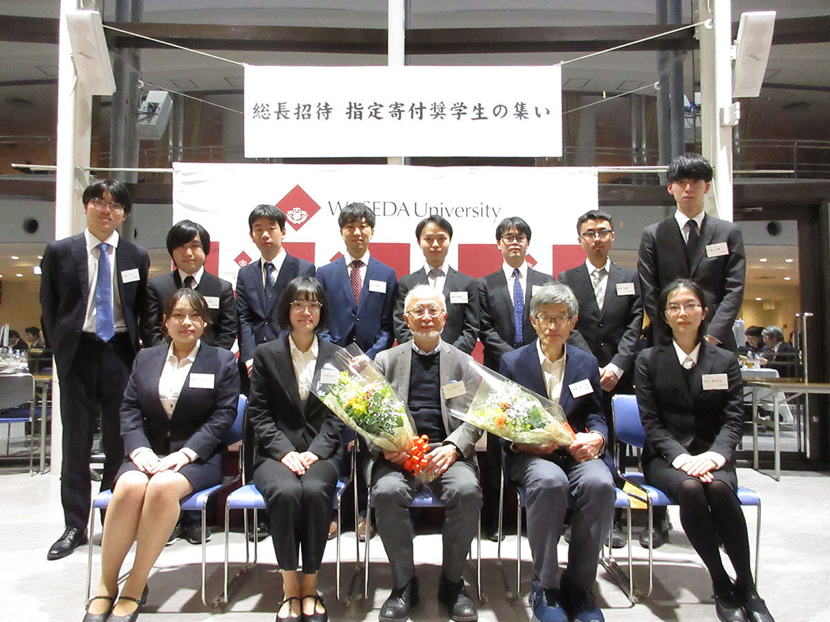 辻󠄀常務理事他が早稲田大学の【総長招待 指定寄付奨学生の集い】に参加し、里見奨学金奨学生22名と懇談しました。奨学生から研究の進捗、日々の生活状況等を聞き、意見交換をしました。